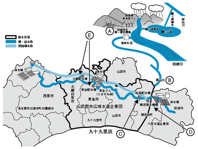 された後、当企業団の大網配水場・東金配水場(E)へ送られ、2つの配水場から 大網白里市、東金市、九十