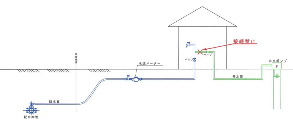 上水道の給水管と井戸水などの水道以外の管が直接接続されていると、バルブの故障や操作不良、閉め忘れにより井戸水などが上水道本管に逆流することがあります。この逆流した水が汚染されていた場合、周辺の上水道水が汚染されるなど、公衆衛生上大きな被害を引き起こす可能性がある為、水道法により禁止されています。また、反対に大量の水道水が井戸などに流れ込み、莫大な水道料金が請求されることになります。