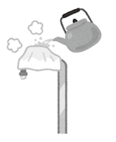 1.自然に溶けるのを待つか、蛇口を開けて、凍結部分にタオルなどをかぶせ、その上からゆっくりとぬるま湯をかけてください。