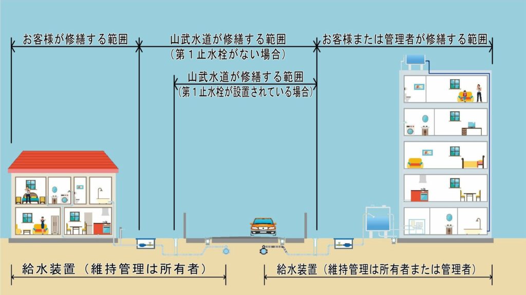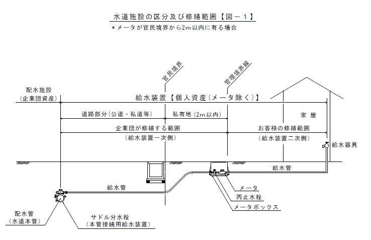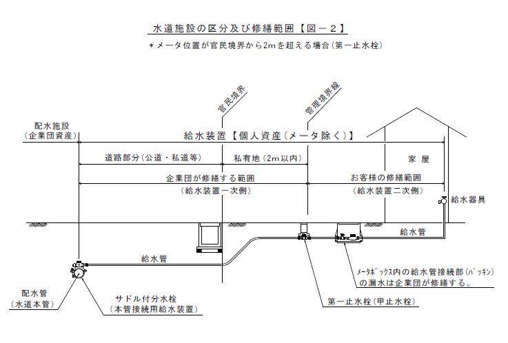 配水管(水道本管)から分岐した給水管(給水装置)のうち、修繕範囲図に示す位置(原則として、道路等官民境界から2mの位置)までです。また、ここに示す位置にメーター或いは第1止水栓がない場合は、漏水修理の施工時または、配水管の入替工事等、企業団の工事を行う際に、メーターの移設或いは第1止水栓を設置します。なお、漏水修理の方法は、土地を掘削して漏水している部分を修繕する工法が基本となりますので、私有地における特殊な土地形状(化粧ブロック、石積み等)の復旧費用の一部は、お客様の負担となる場合もありますので、御理解と御協力をお願いいたします。