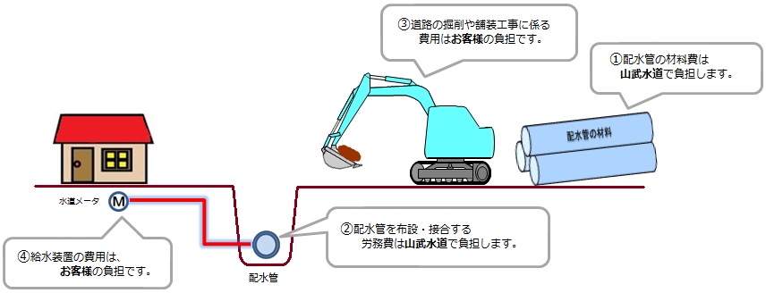 お客様が上水道に加入する際に、前面道路に配水管が整備されていない場合は、お客様が申請した場所まで配水管を布設し、その配水管から申請地内に給水管を引きこむことにより、給水が可能となります。※原則:配水管の布設費用はお客様の負担で行います。